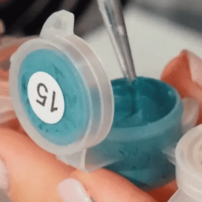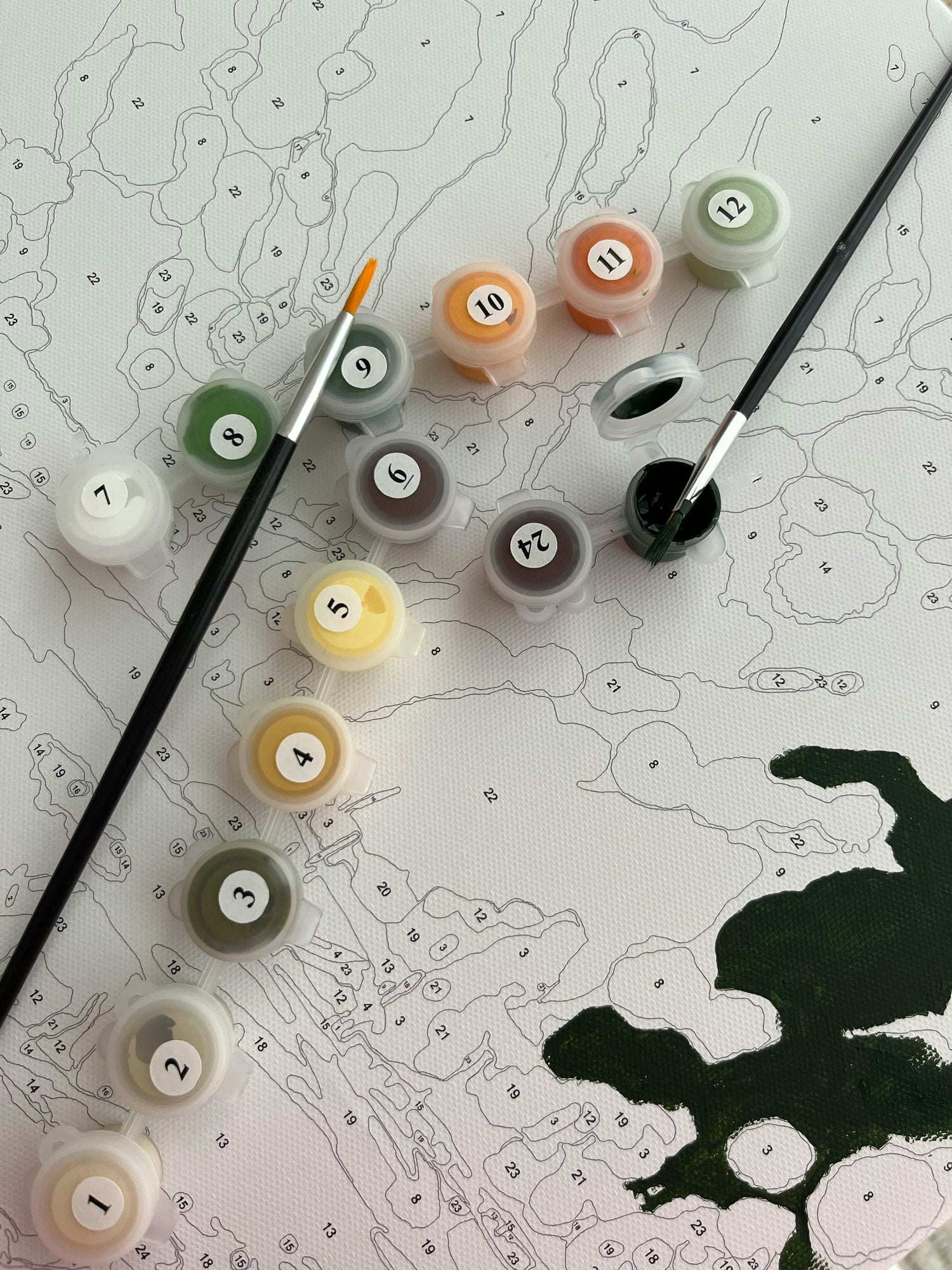 Small pots of paint, each labeled with a number that matches the corresponding sections on the canvas, ensuring a simple and organized painting experience.